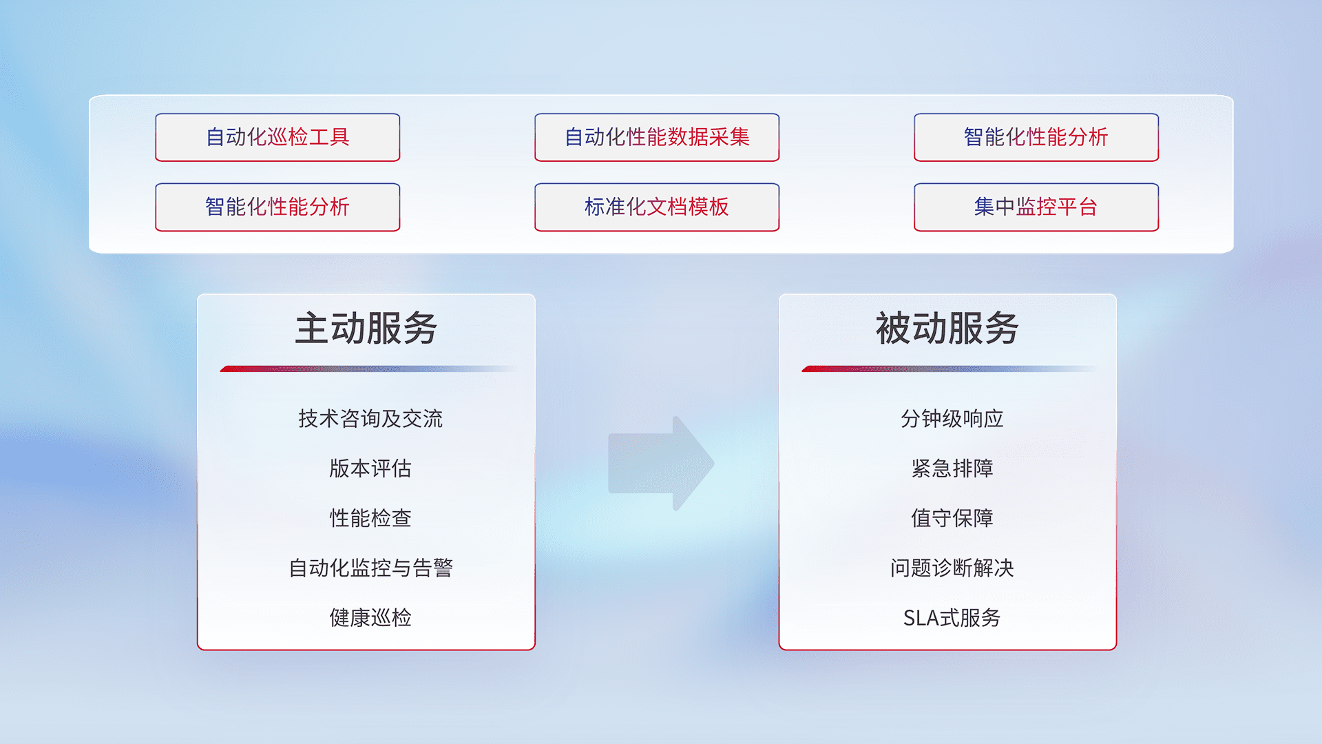 智能化工具和标准化文档,,,,保障服务质量,,,提供主动服务(包含技术咨询、、、、版本评估、、、性能检查、、自动化监控与告警、、、健康巡检)和被动服务包含(分钟级响应、、紧急排障、、、、值守保障、、问题诊断解决、、、、SLA服务)。。。