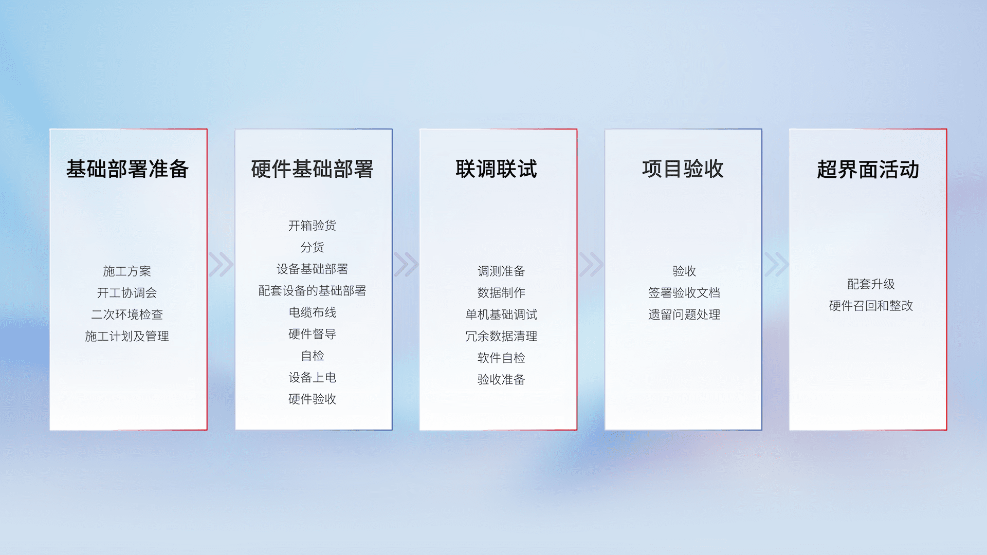 从基础部署准备、、、硬件基础部署、、、、联调联试、、、、项目验收、、、越界面活动的全过程可追溯,,,保证施工质量和进度。。